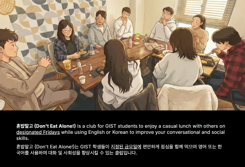 혼밥말고 (Don't Eat Alone!) is a club for GIST students to enjoy a casual lunch with others on designated Fridays while using English or Korean to improve your conversational skills. To see our Friday schedule and to join our lunch, please click on this Google link and remember that seating is limited to 5 people: